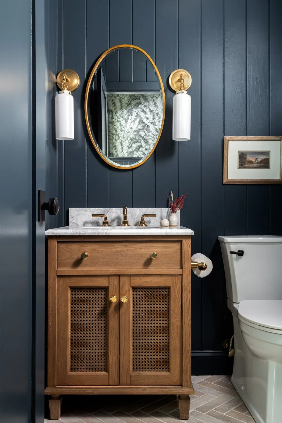 Extending beyond the main mudroom area, the project flows into the hallway and powder room, where the design elements continue with the addition of wallpaper and dark blue paneling. A closet was converted to add additional bench seating and storage to maximize available space and integrate more storage. In the powder room, a warm wood vanity with brass hardware softens the dark moody paneling.