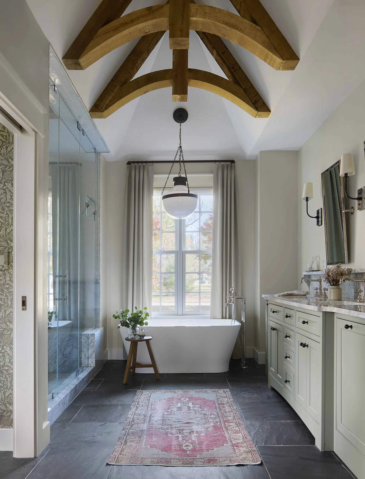 In our Trad and Timber Retreat Black tile floor contrasts beautiful with a pale green shade paint for the cabinetry. Wood arched beams create an architectural focal point, with a free standing bathtub.